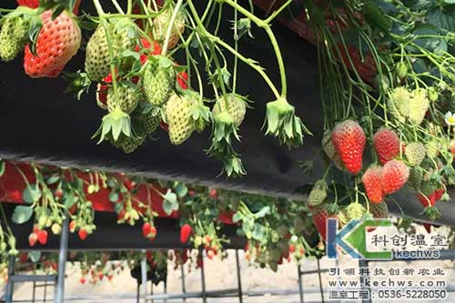 本案例為高架草莓無土栽培模式,包括最新的水肥一體化技術(帶自動檢測功能),能夠精準控制草莓所需水肥的施用量,在草莓生長每個階段精準施肥施水,達到提高產量和品質的目的。傳統的草莓種在地上,不僅彎腰勞作工作強度大,而且難以避免病蟲害的侵擾。高架草莓種植的突出優勢是讓植物有較好的采光條件,以及能夠有效控制植物根部的溫濕度,給瓜果蔬菜創造最好的生長條件。