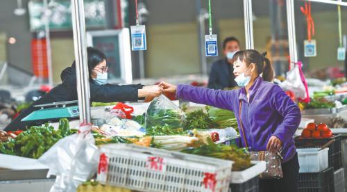 市民在問(wèn)津菜場(chǎng)菜攤買(mǎi)菜。 長(zhǎng)江日?qǐng)?bào)記者 許魏巍 攝